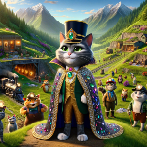 Once upon a time, in a lush green valley surrounded by towering mountains, there lived a remarkable cat named Sir Whiskerton. Sir Whiskerton was no ordinary cat; he was the proud owner of the Sparkling Gem Mine, the grandest mine in all the land. But what made Sir Whiskerton truly unique was his attire. He always dressed in royal garb—a majestic cape, shimmering with jewels, and a splendid crown. Yet, atop his regal head sat something rather unusual for a king: a train conductor’s hat, which he wore with great pride.