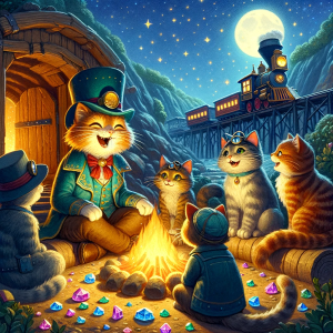 Every evening, after a hard day’s work, Sir Whiskerton would gather his cat workers around a cozy campfire at the mouth of the mine. Under the starlit sky, he would share his greatest dream with them: to be a train conductor on a magical train that traveled all the way to the moon. His eyes would sparkle brighter than the gems in his mine as he spoke of this dream.