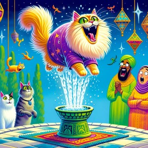 The day of the grand unveiling arrived. Princess Fluff, with a dignity that only cats possess, stepped gracefully onto the Kitty Bidet. The family held their breath as Mr. Green pressed the button to activate it. Suddenly, a large and powerful jet of water sprang forth, catching Princess Fluff by surprise. With a yelp that sounded more like a royal decree, she leaped an astonishing ten feet into the air, landing with a fluffy poof on the living room carpet.